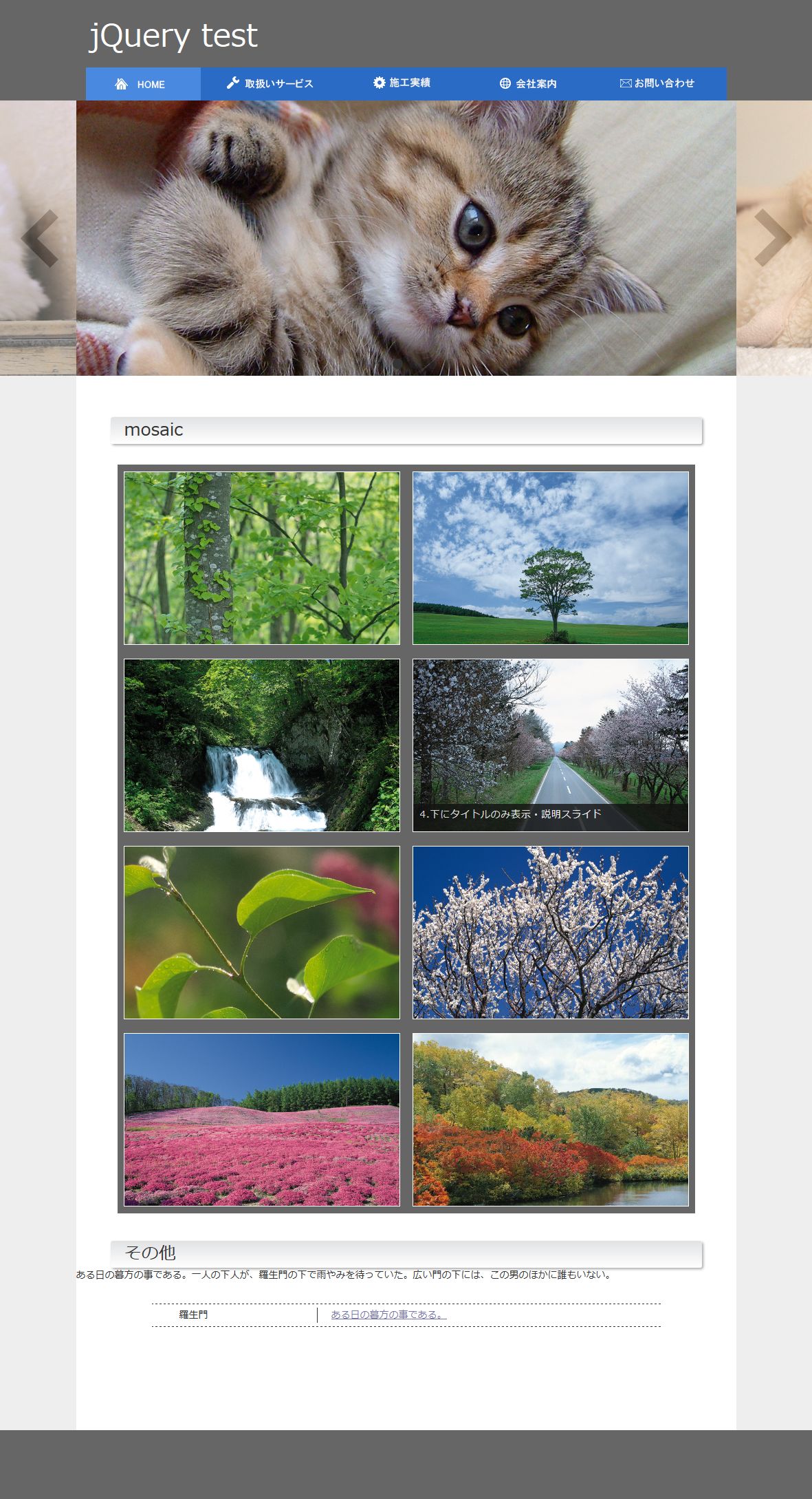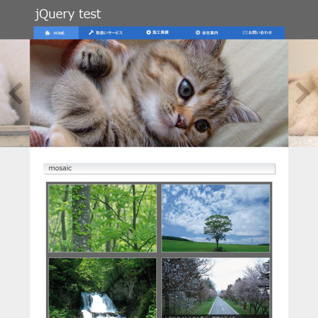 jQuery使用サンプル JQueryを使用したサンプルページを制作しました。 制作年月 2015年2月 カテゴリー Web Design 制作環境 Illustrator, Photoshop, jQuery サイトURL http://kuros.j-fr.com/jquery_test/